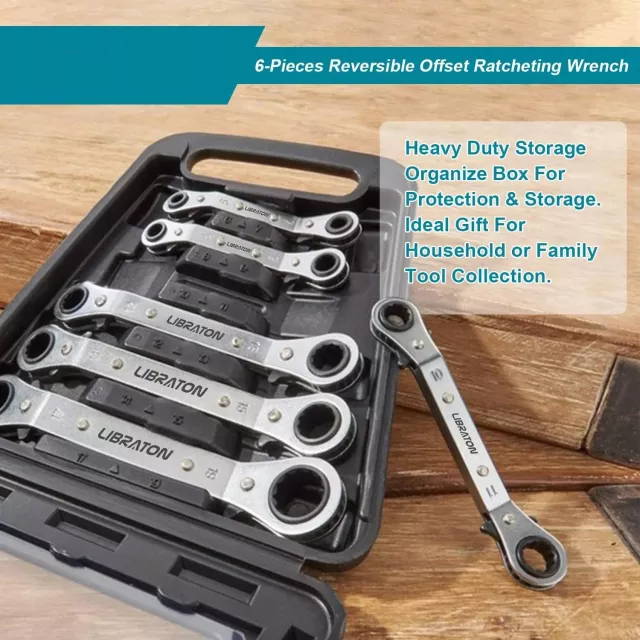 Take on mechanical tasks with confidence using this versatile 6-piece offset ratcheting box-end wrench set. Each wrench is built to deliver smooth, reliable performance where standard tools fall short. With a smart 20-degree offset and double box-end design, this set gives you the reach, leverage and control you need when working in confined areas or around long studs. Whether you’re repairing equipment, assembling projects or tackling automotive and household jobs, these wrenches make every turn easier.