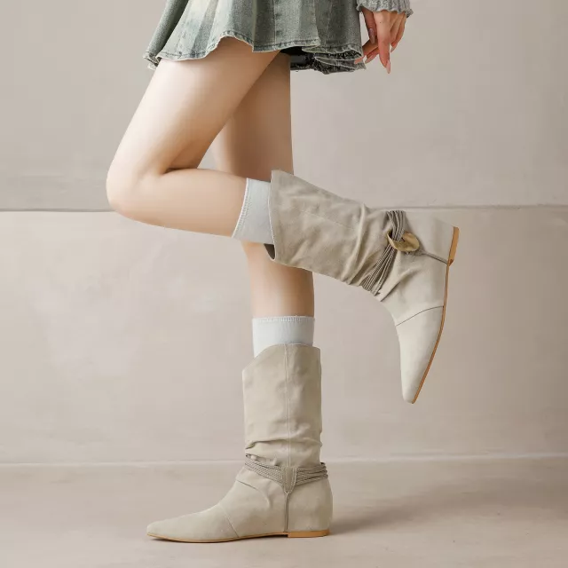 These boots are handmade with attention to detail, featuring a pointed toe for a chic, elongating effect and a low heel (about 0.4–1.2 inches) for all-day comfort. The durable rubber outsole provides stability on winter surfaces, while the mid-calf height gives just the right amount of coverage—above the ankle but below the knee. Their solid suede finish, inspired by Rome-influenced fashion elements, makes them easy to style with dresses, leggings, or tailored pants.