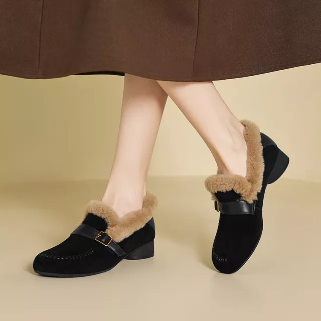 These loafers feature a classic round-toe shape and a low 1–1.2 inch heel that supports natural walking comfort. Whether you’re heading to work, running errands, or meeting friends for a relaxed outing, these shoes are your go-to choice for casual winter days. The slip-on design makes them quick and easy to wear, while the solid craftsmanship and hand-stitched details elevate their overall look. With their timeless design and versatile black suede exterior, they’re perfect for pairing with jeans, leggings, winter skirts, and cozy sweaters.
